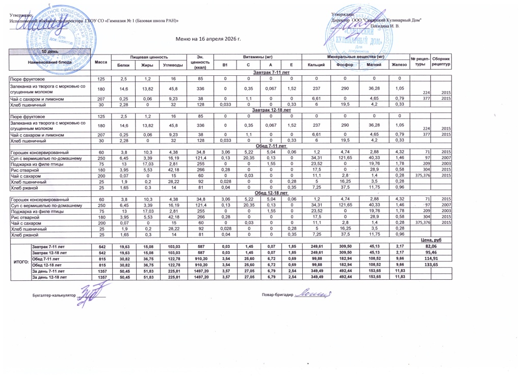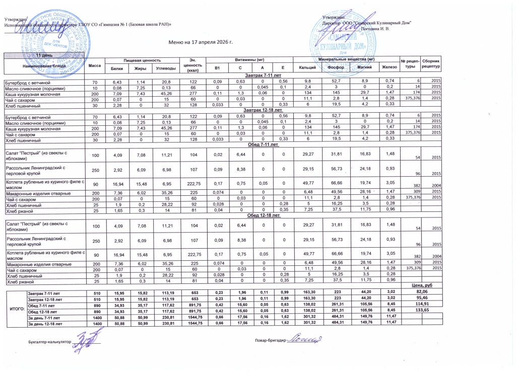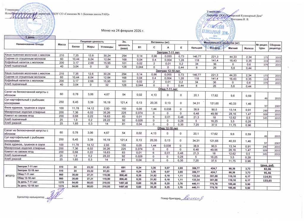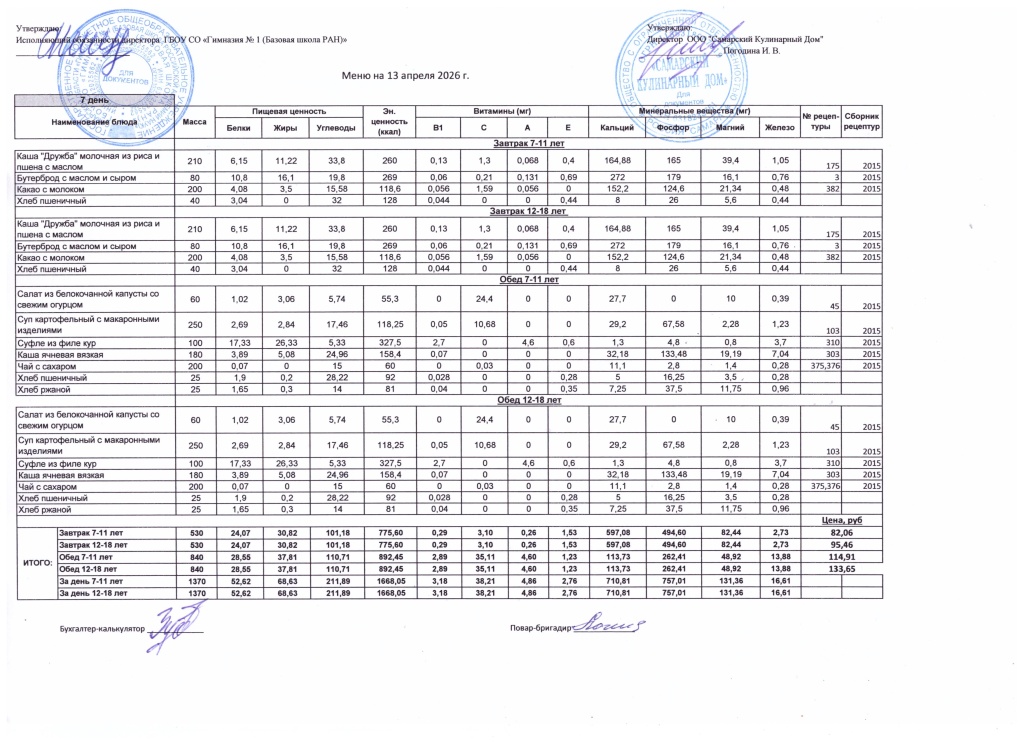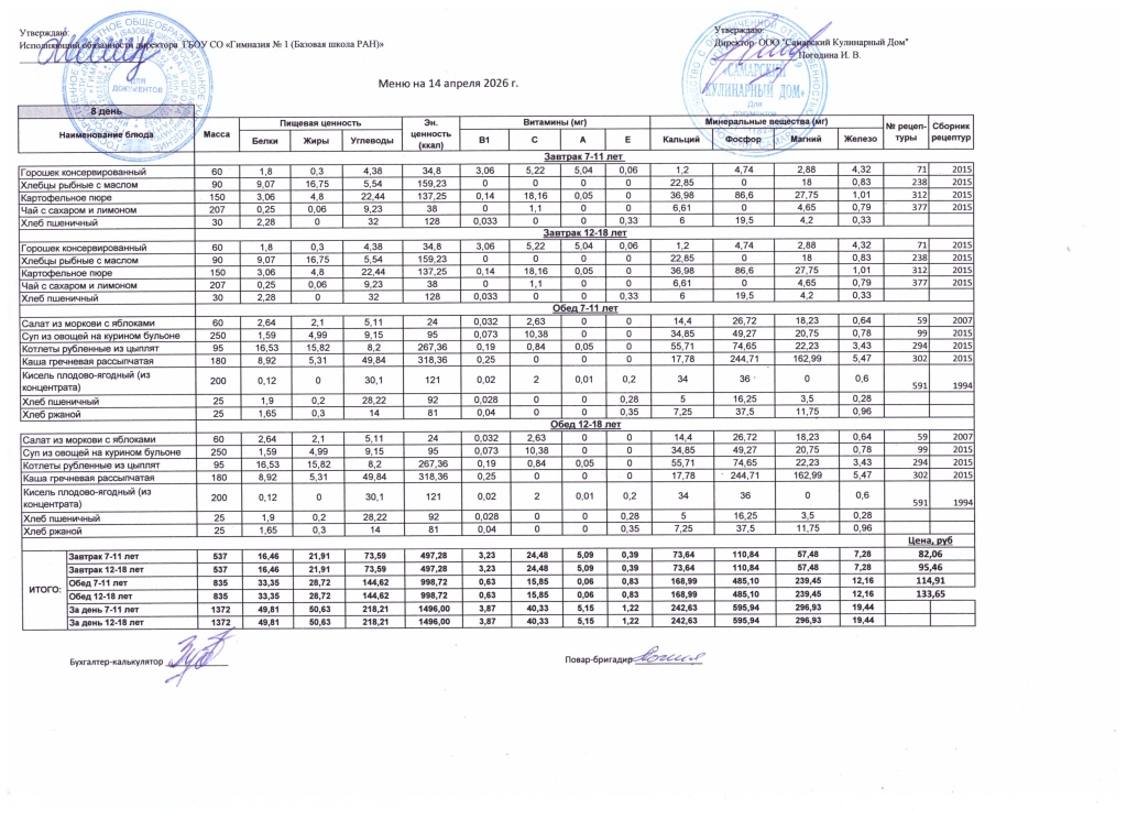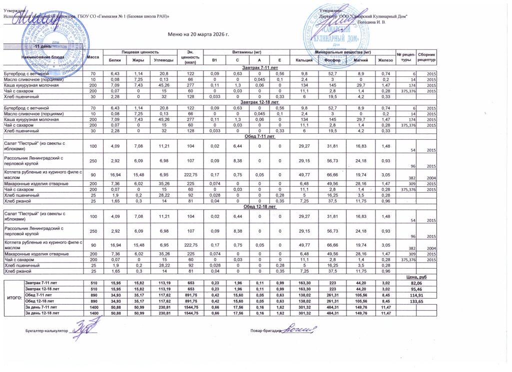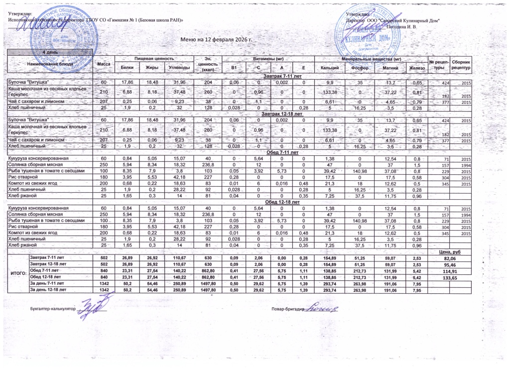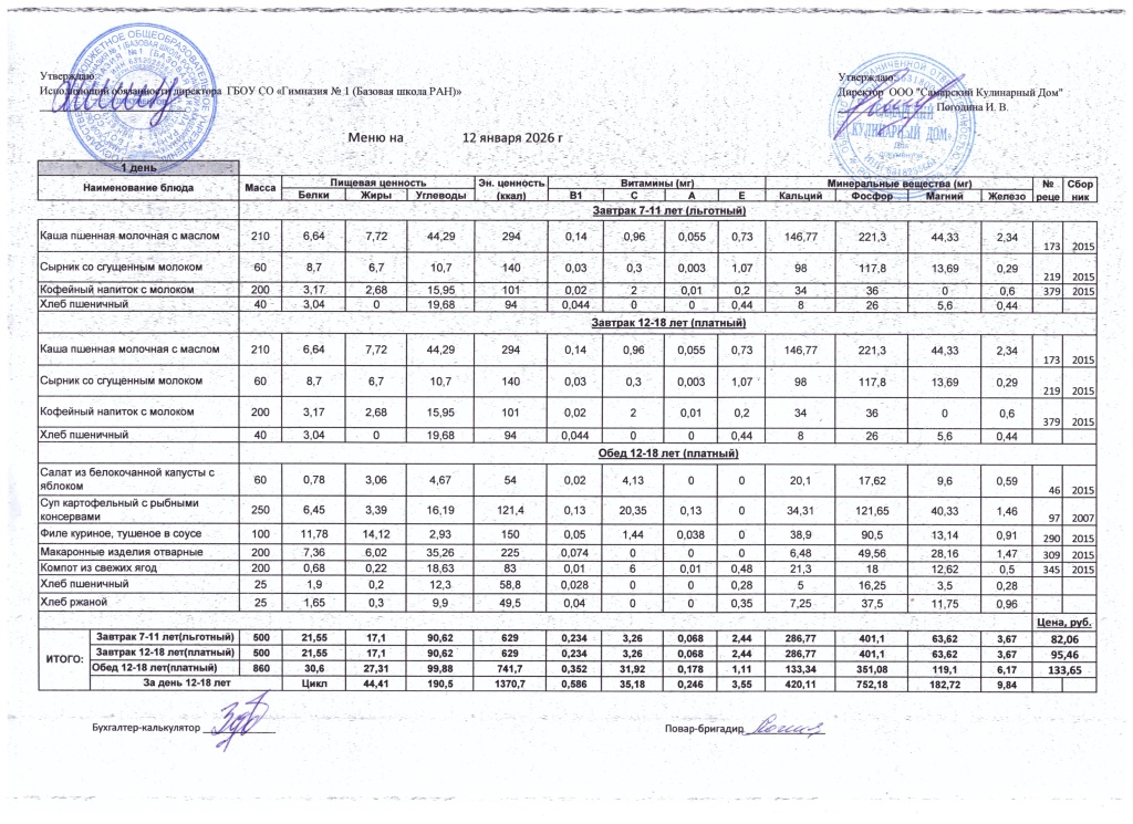 Примерное 12-ти дневное меню бесплатного питания обучающихся 1-4 кл