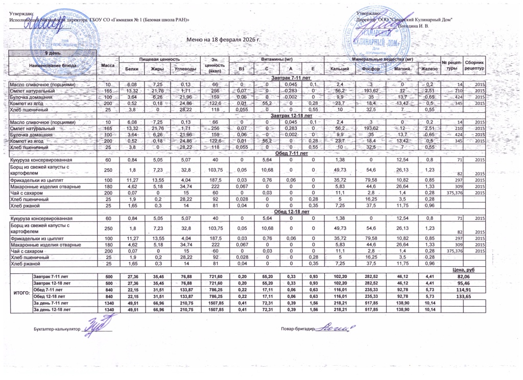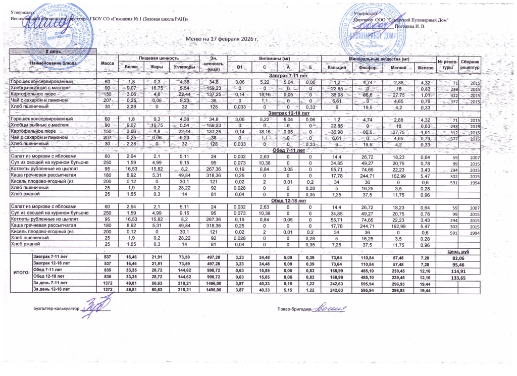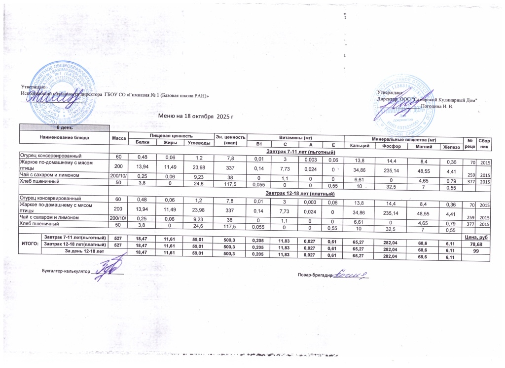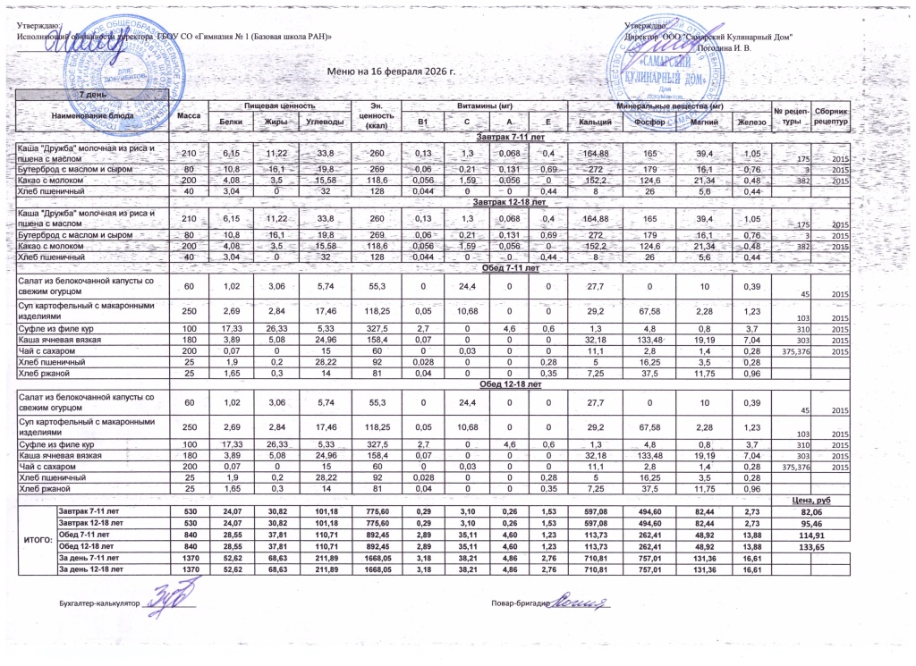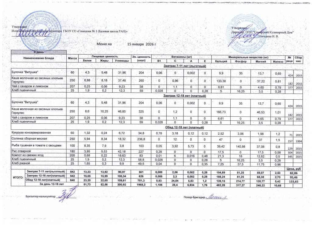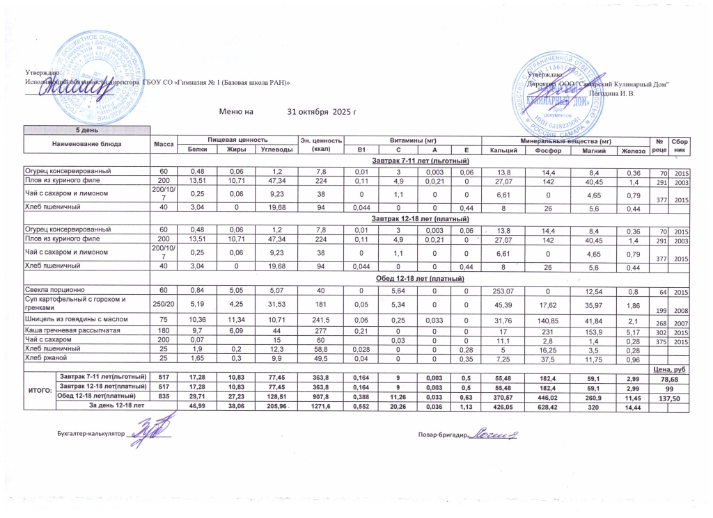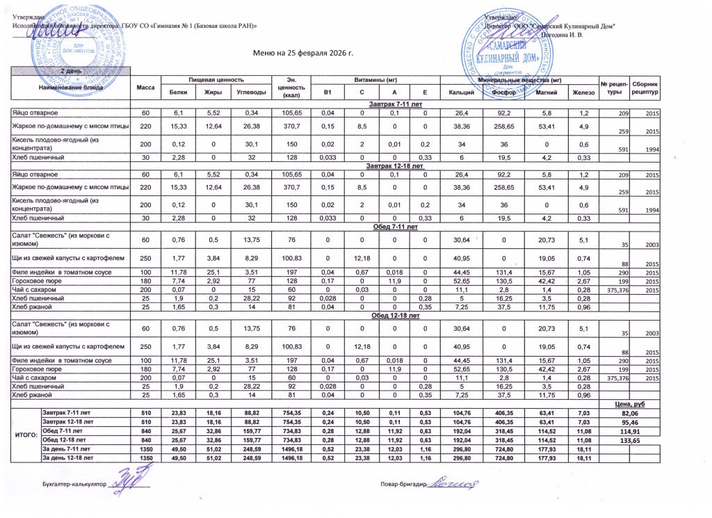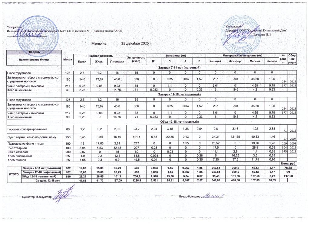 Примерное 12-ти дневное меню бесплатного питания обучающихся 1-4 кл