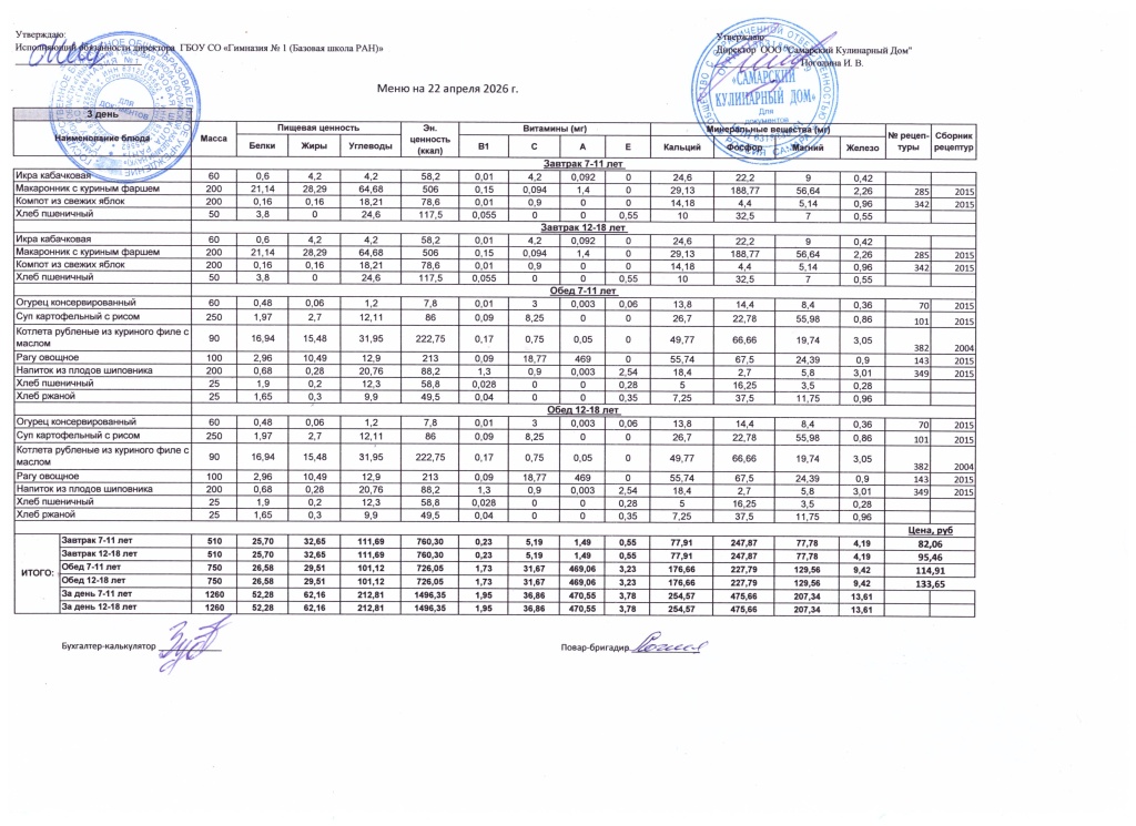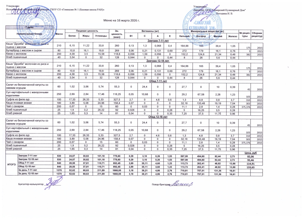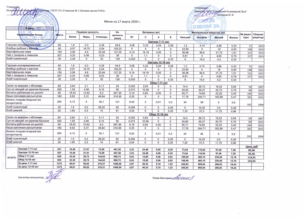 - соблюдением норм закладки сырья, обеспечивающие правильный выход полуфабрикатов и готовых изделий, объёмом порций в соответствии с возрастной категорией учащихся;