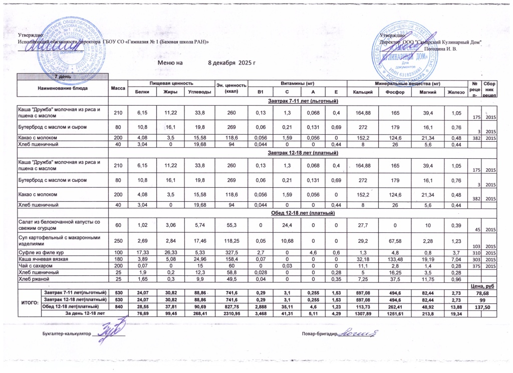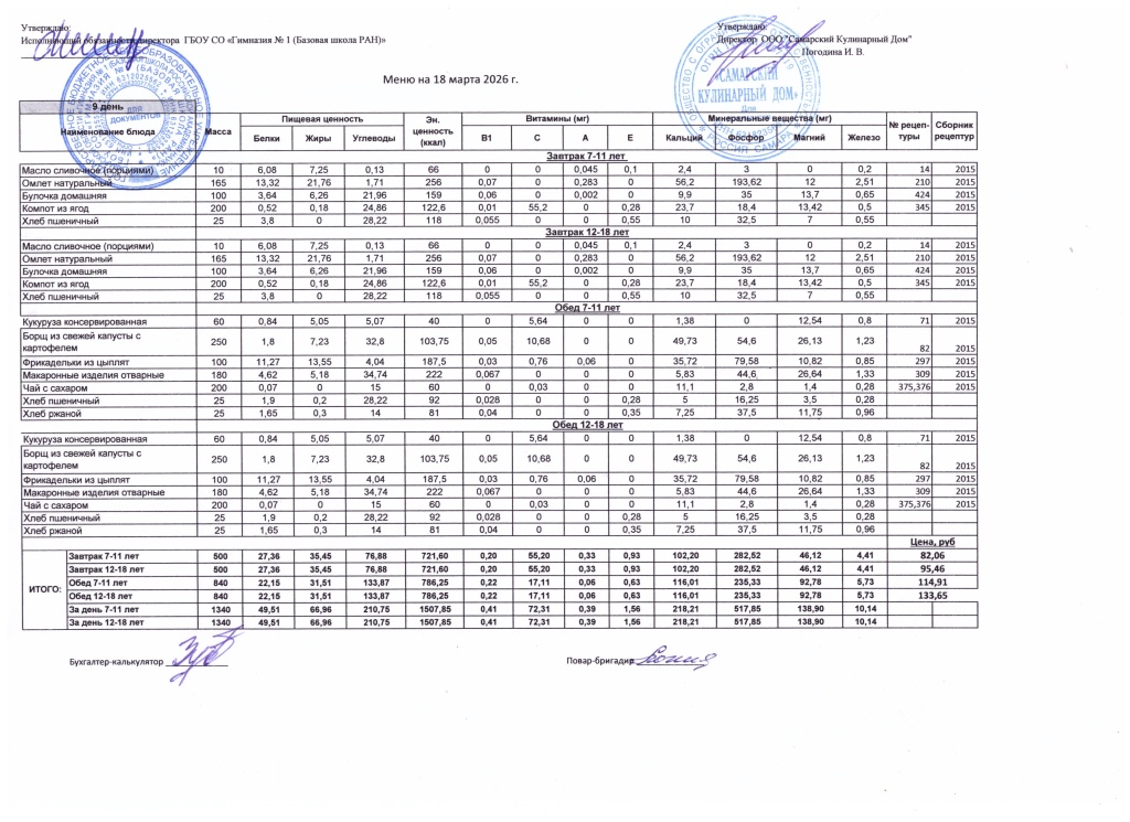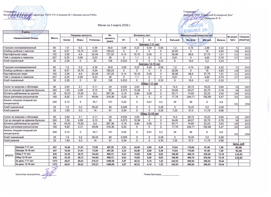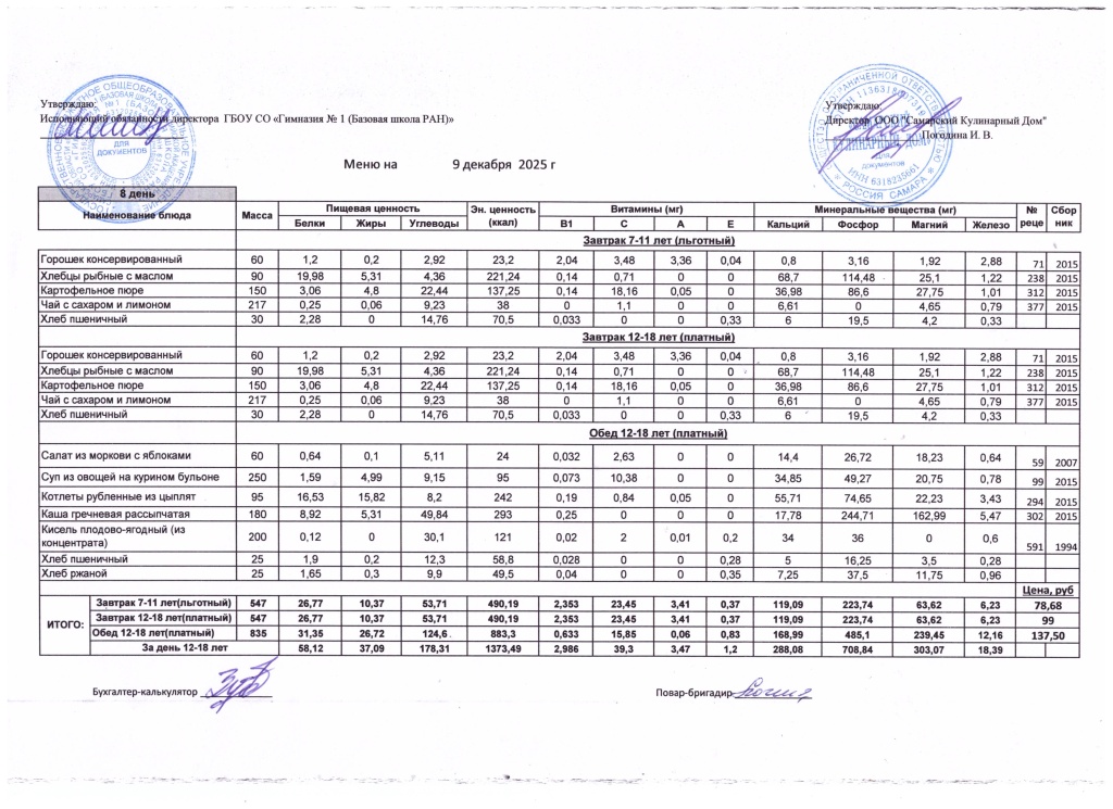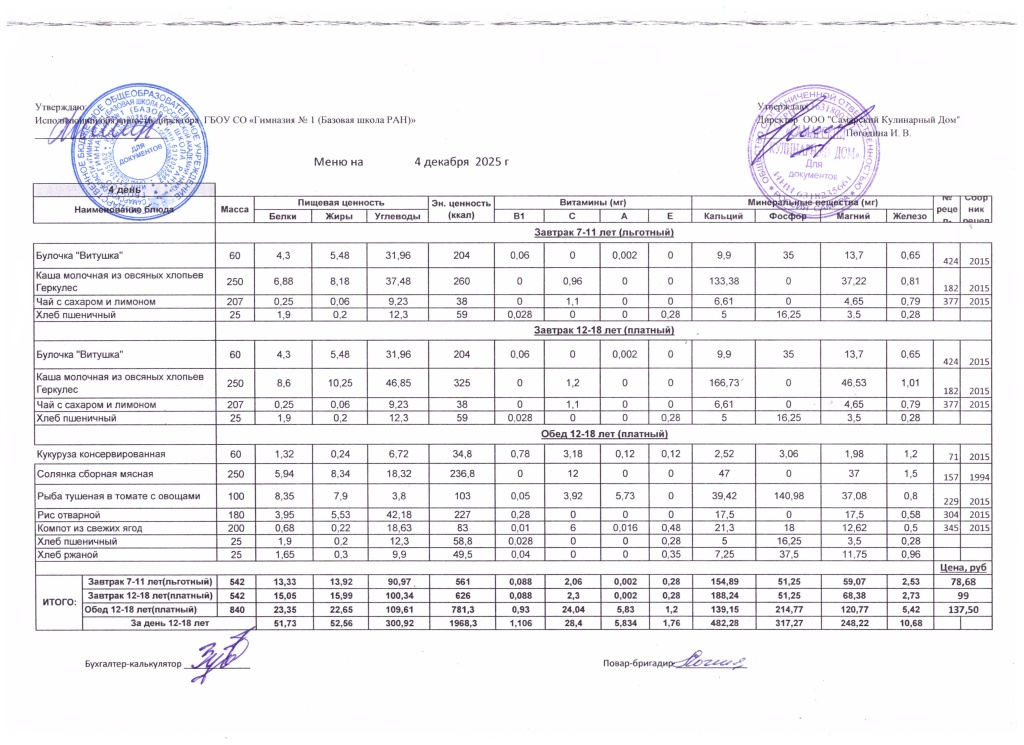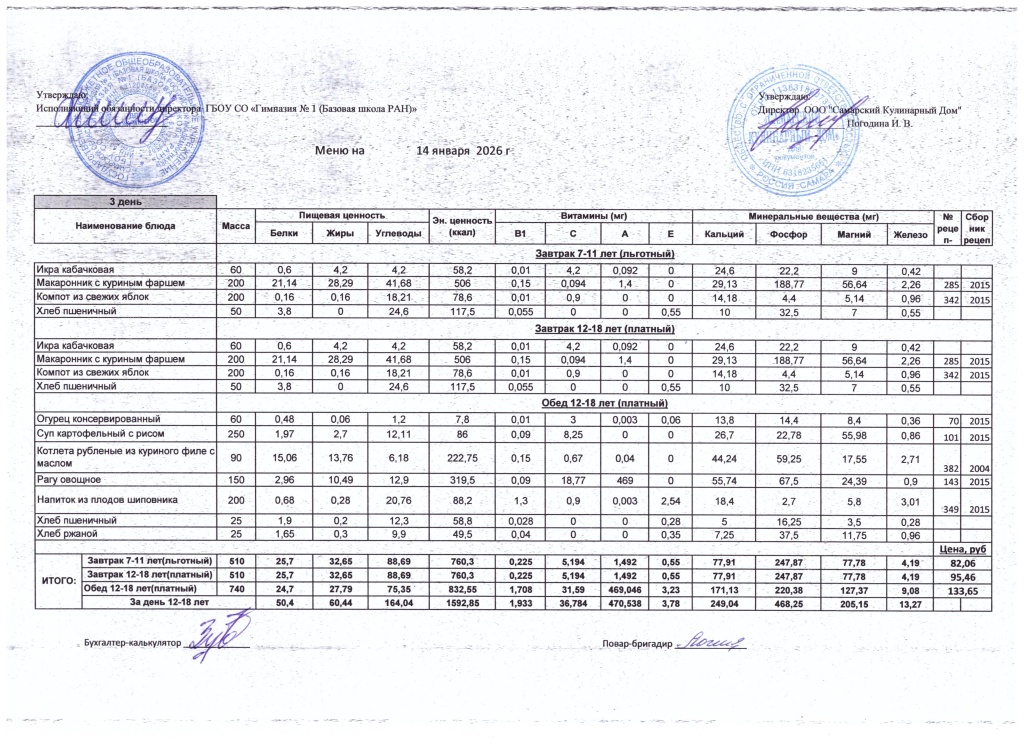 Примерное 12-ти дневное меню бесплатного питания обучающихся 1-4 кл